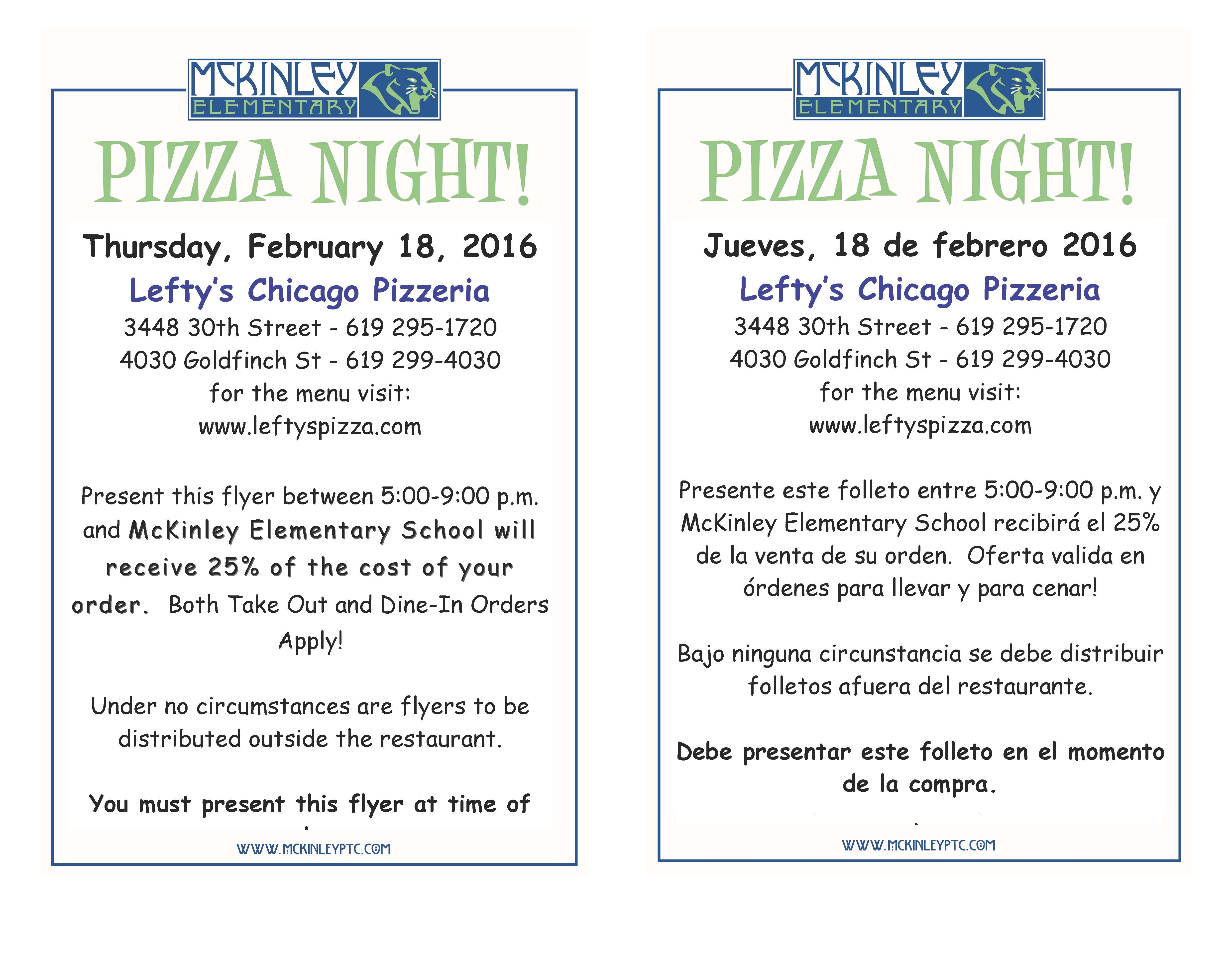 Present flyer between 5 and 9 pm and McKinley Elementary will receive 25% of the cost of your order.