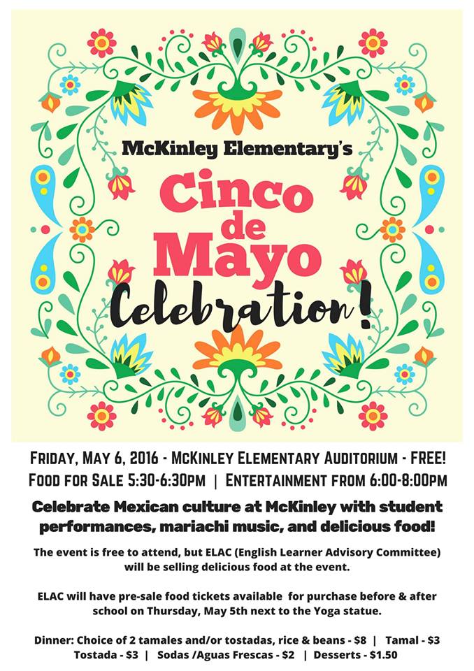 The event is free to attend, but ELAC (English Learner Advisory Committee) will be selling delicious food at the event. ELAC will have pre-sale tickets for our Cinco de Mayo Festival available for purchase before and after school on Thursday, May 5th next to the Yoga statue.
