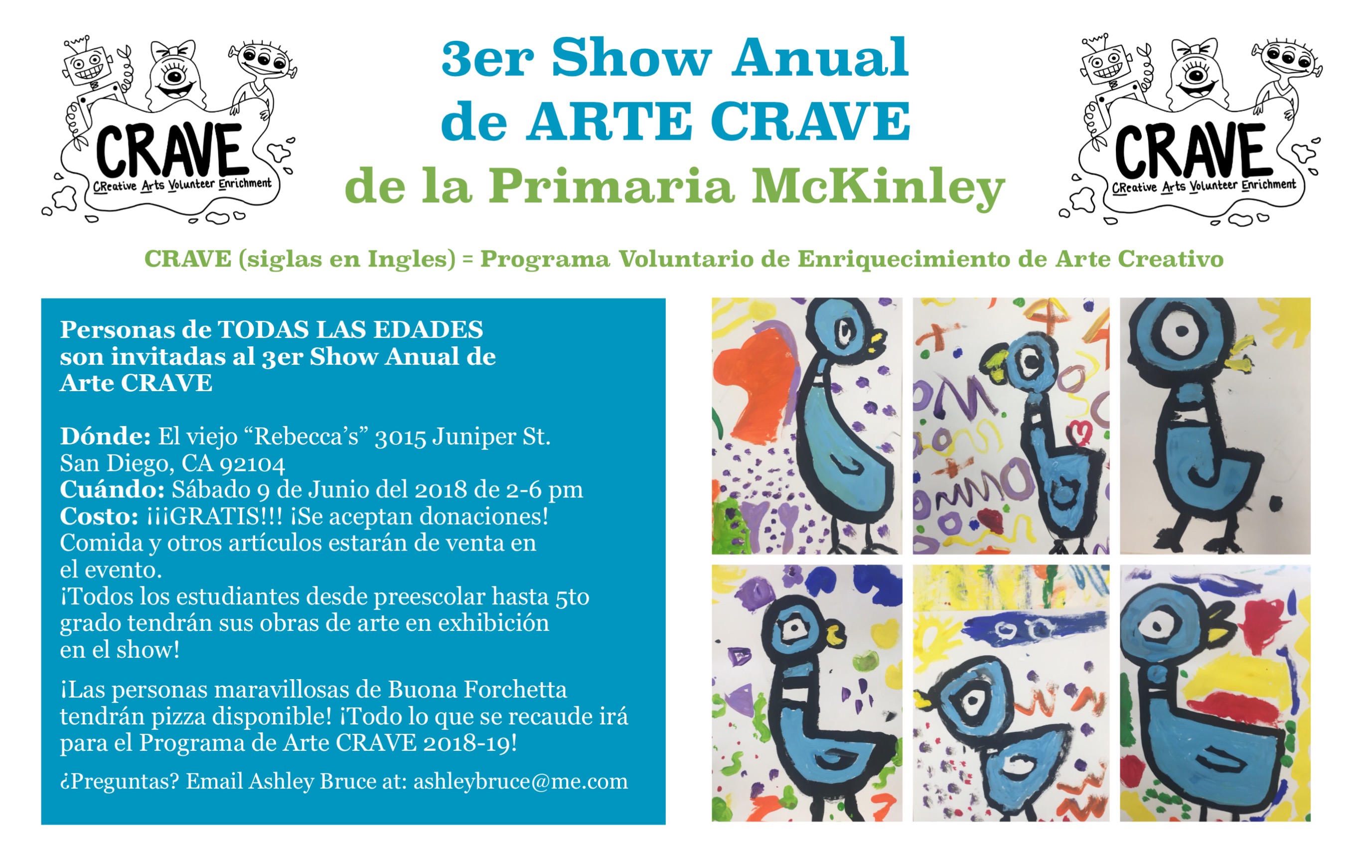 Please Join us for our 3rd Annual CRAVE Art Show on June 9th, 2018, from 2:00 – 6:00 pm. This year we have a new location for the show! We will be transforming the corner of 30th and Juniper in North Park at the old “Rebecca’s” with art from all of our McKinley Students (3015 Juniper Street). See our flyers here: English and Spanish.